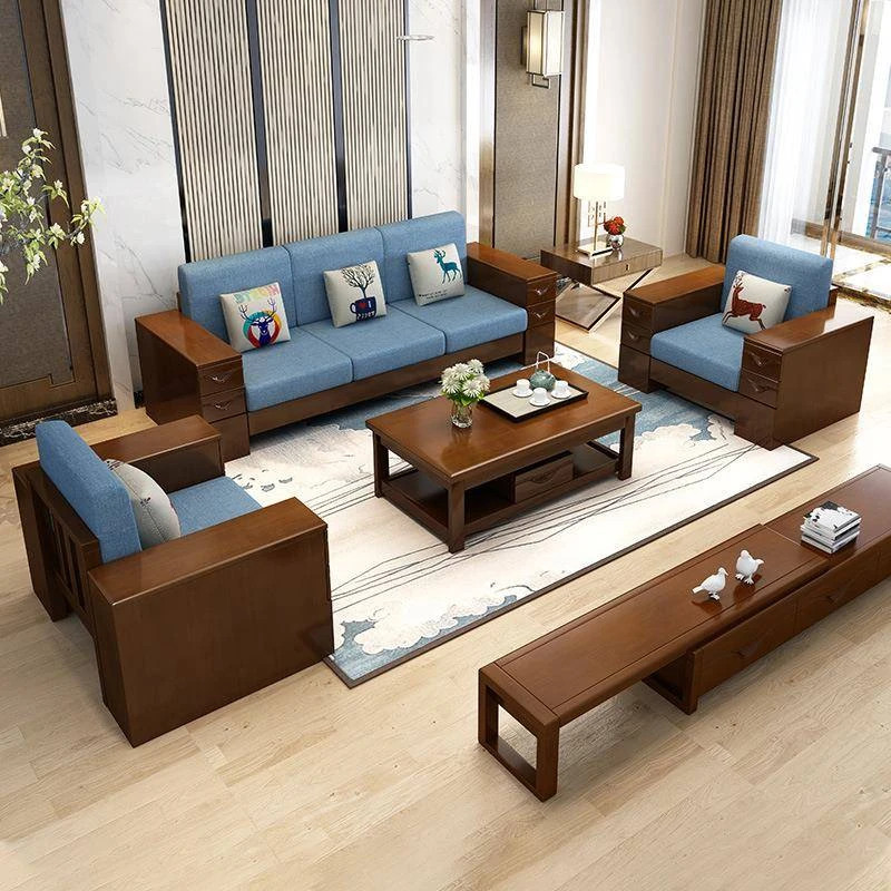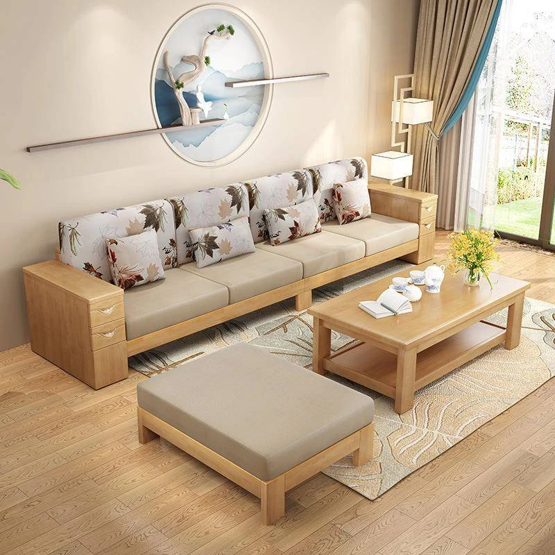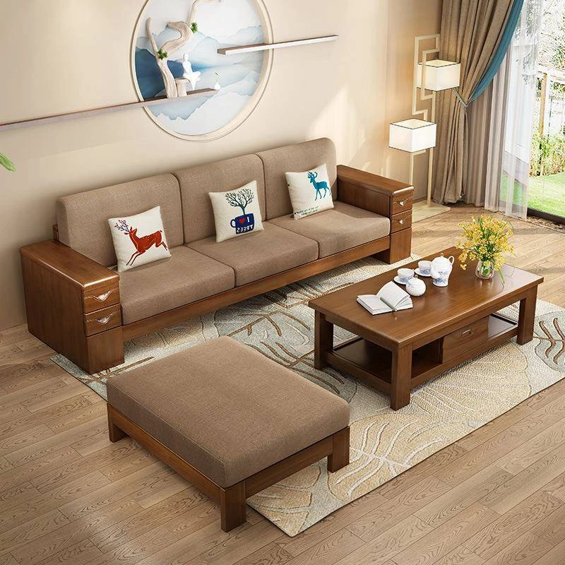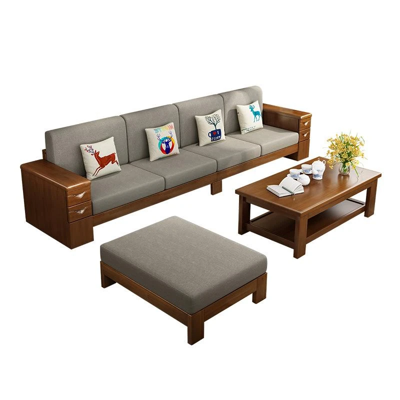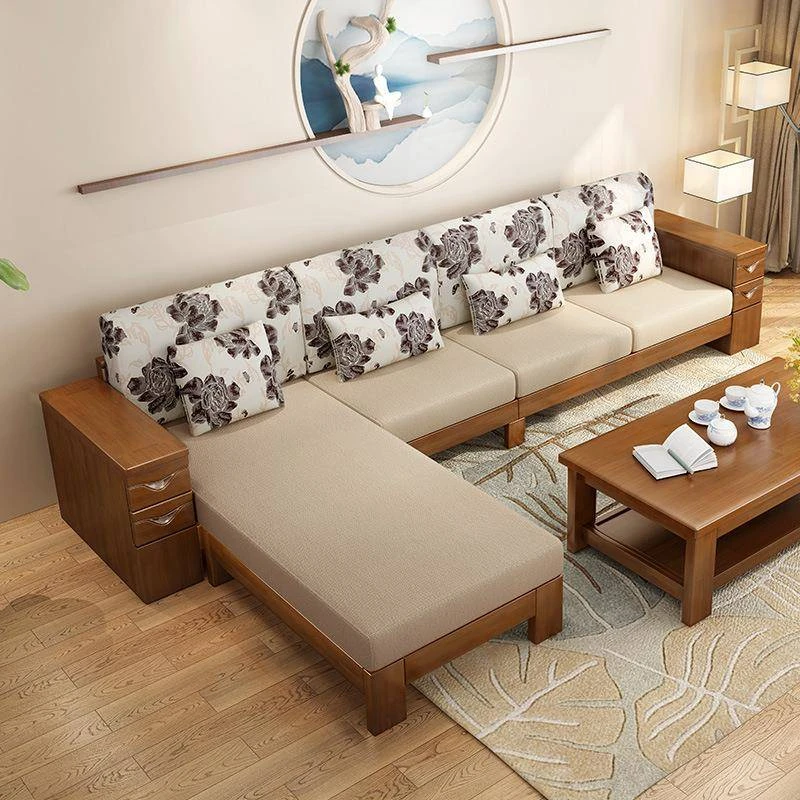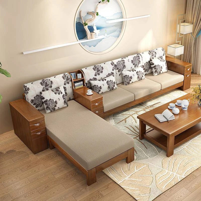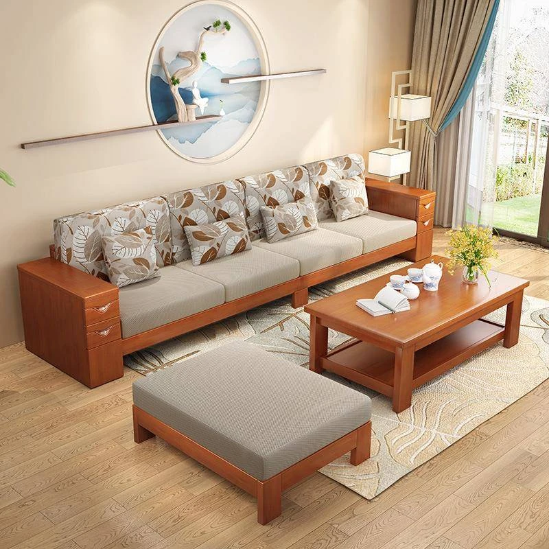 天然木材使用の全実木リビングソファセット!七字型のコーナーにぴったりな中華風デザイン。布張りで快適、茶卓とテレビ台付きの高品質ラバーウッド家具。心地よい空間を演出します!