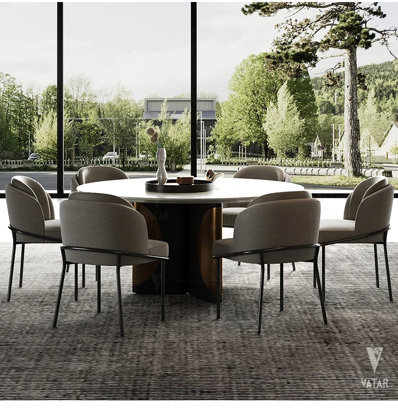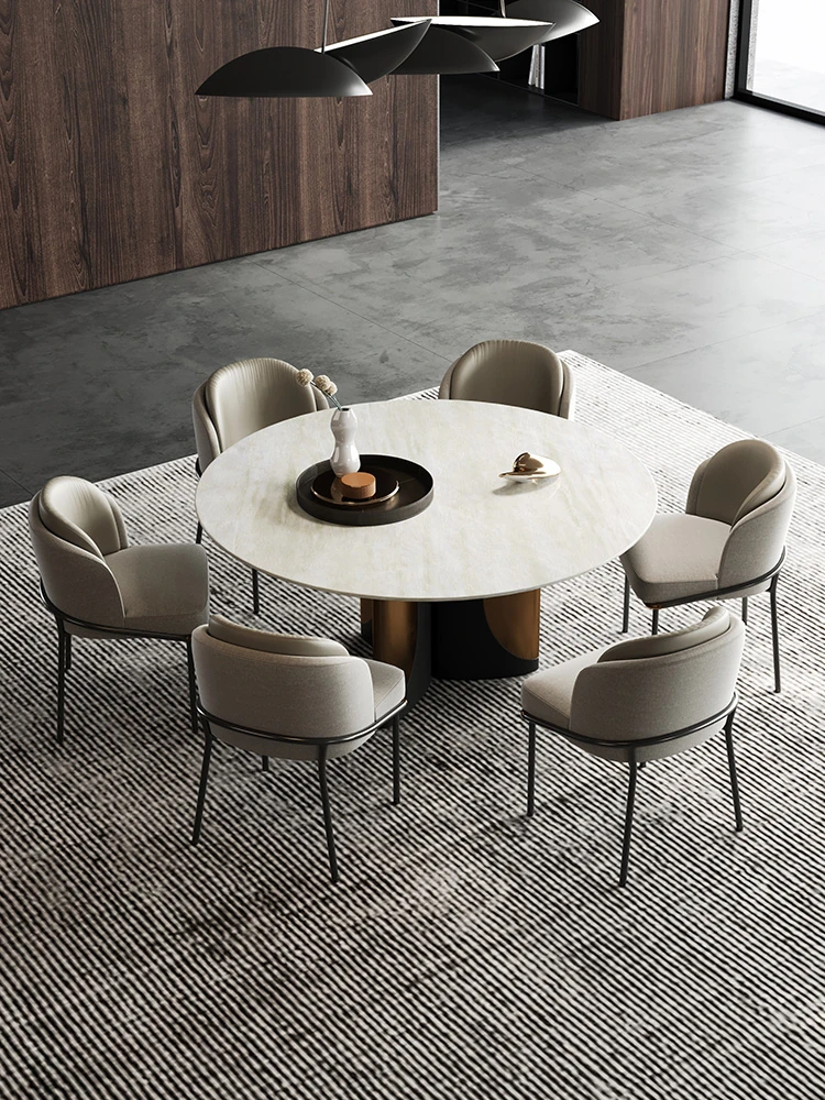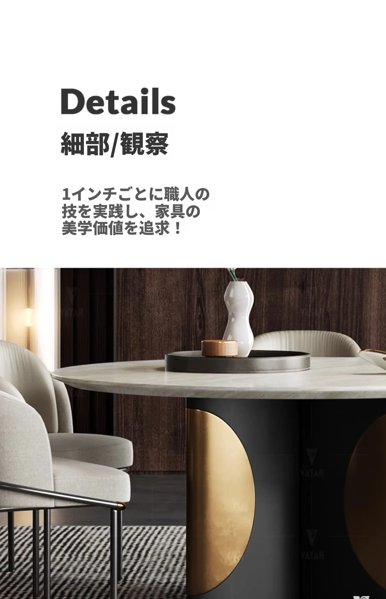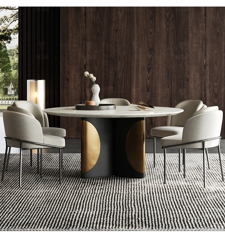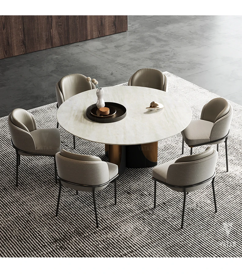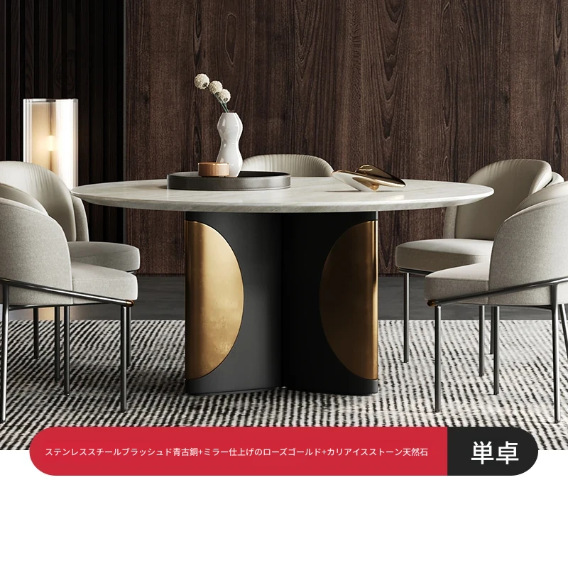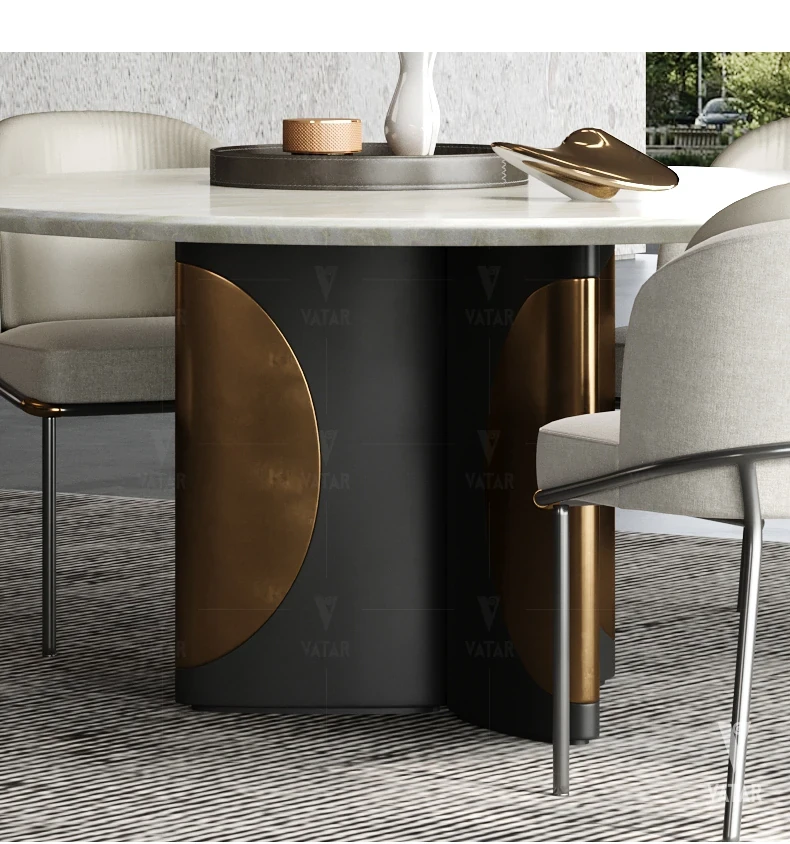 VATARヴァンダラウンドダイニングテーブル - ステンレス製、イタリアンミニマリズムの天然高級石を使用した、洗練された食卓。おしゃれで機能的なデザインで、あなたの食事シーンを格上げします!
