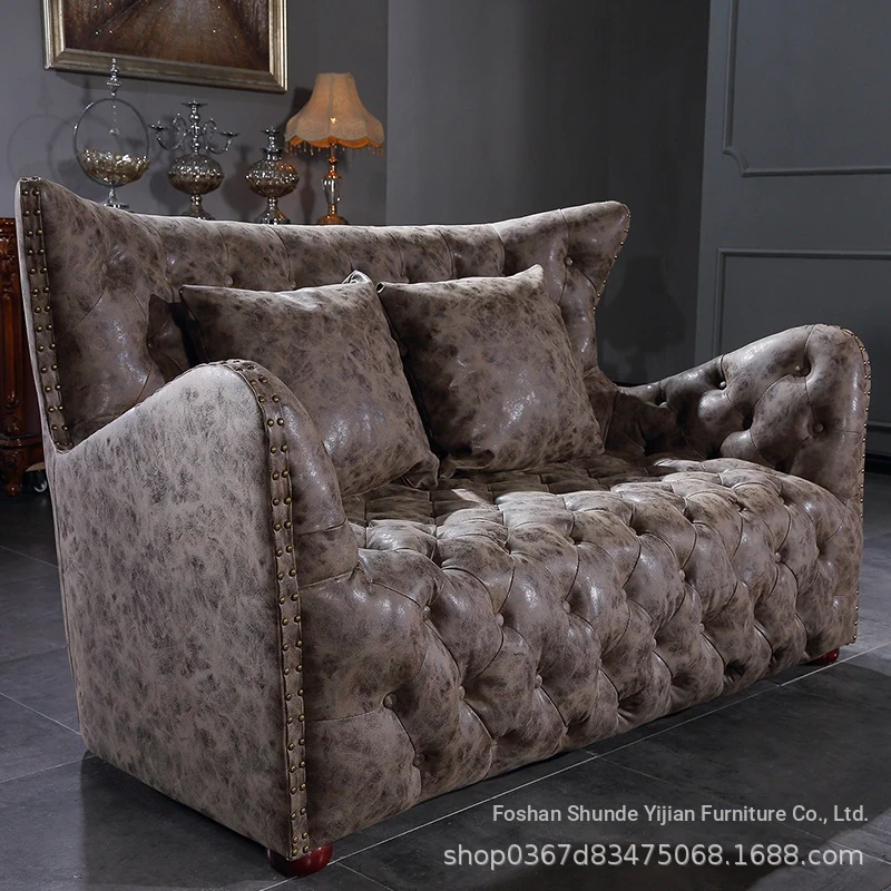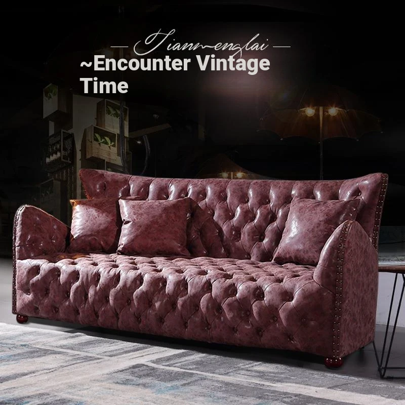 Vintage American Style Distressed Leather Sofa Set - Single, Double, and Triple Seat Options for Living Rooms, Hotels, and Study Rooms - Elegant Upholstery with Tufted Design