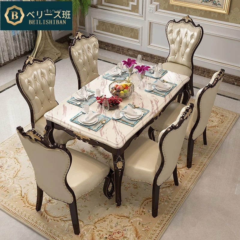ベリー アメリカンスタイル 大理石ダイニングテーブルセット 1テーブル6チェア 長方形 エボニー色 高級天然木製ダイニングテーブルで贅沢な食事体験を!