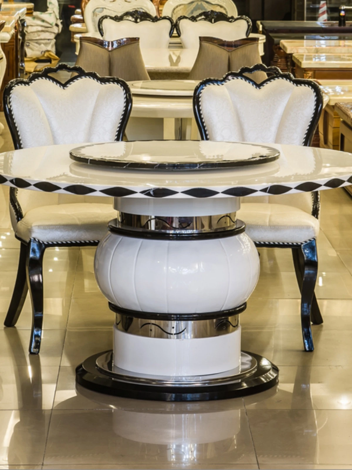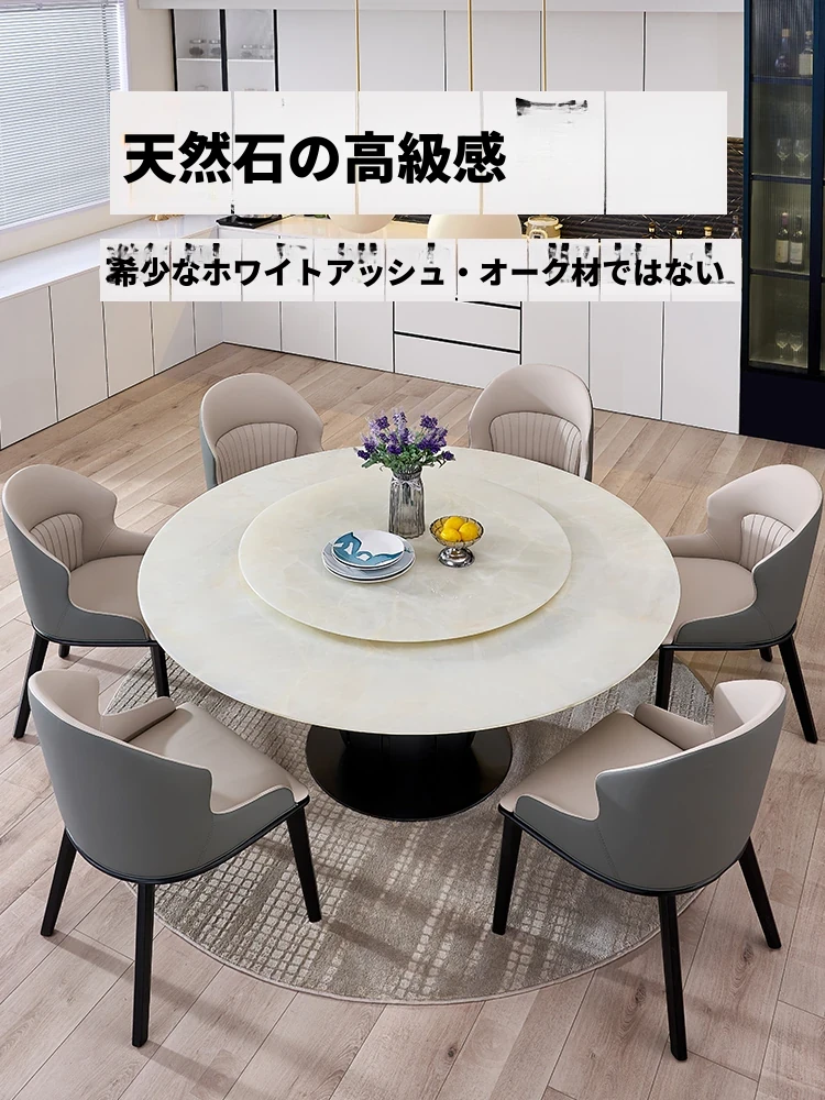 エレガントな欧風大理石ダイニングテーブルセット モダンミニマルデザイン 6人用円形テーブル 回転式天然木製テーブルで食事を楽しもう!