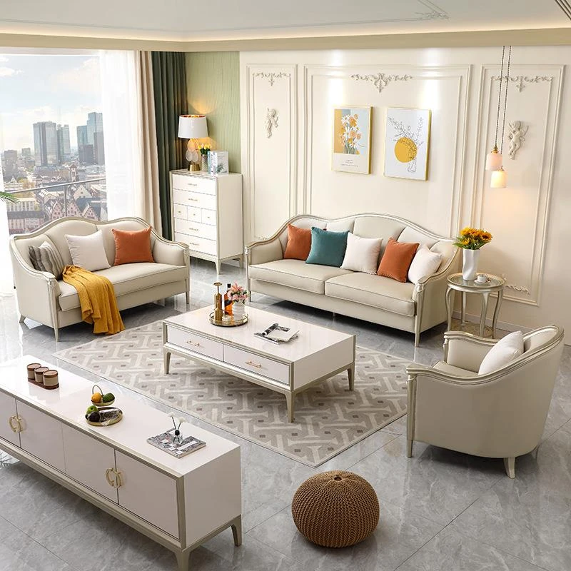 アメリカンスタイルの無垢材ソファとシンプルなリビングテーブルのセット - フレンチラグジュアリーな極簡スタイルで、上質な空間を演出します。全て揃った一式で、洗練されたライフスタイルを手に入れましょう!
